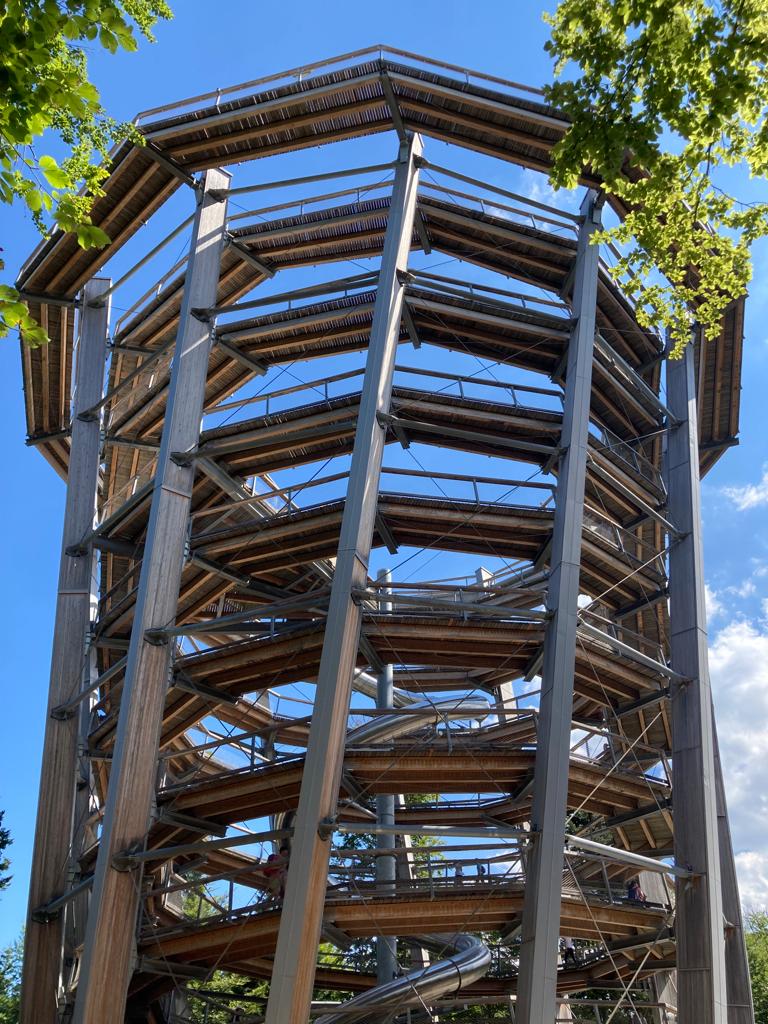 En nuestro caso solo entró en el parque Diana con el peque que, milagrosamente, ¡recuperó todas sus fuerzas cuando vió el parque! Y yo así aprovechaba para visitar otra atracción que, como no…, ¡también era de pago! Estoy hablando de “Baumwipfelpfad Schwarzwald”. Es decir, la torre mirador con el tobogán.