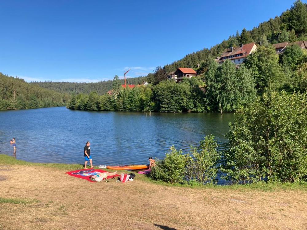 Una vez volví de la torre ya nos fuimos a buscar el coche en el parking y fuimos a pasar la tarde en un lago donde te puedes bañar. El lago se llama “Nagoldtalsperre” y está en la localidad de Erzgrube. Se encuentra a 38 km. de Sommerberg y hay diferentes parkings al lado del lago para poder aparcar el coche.