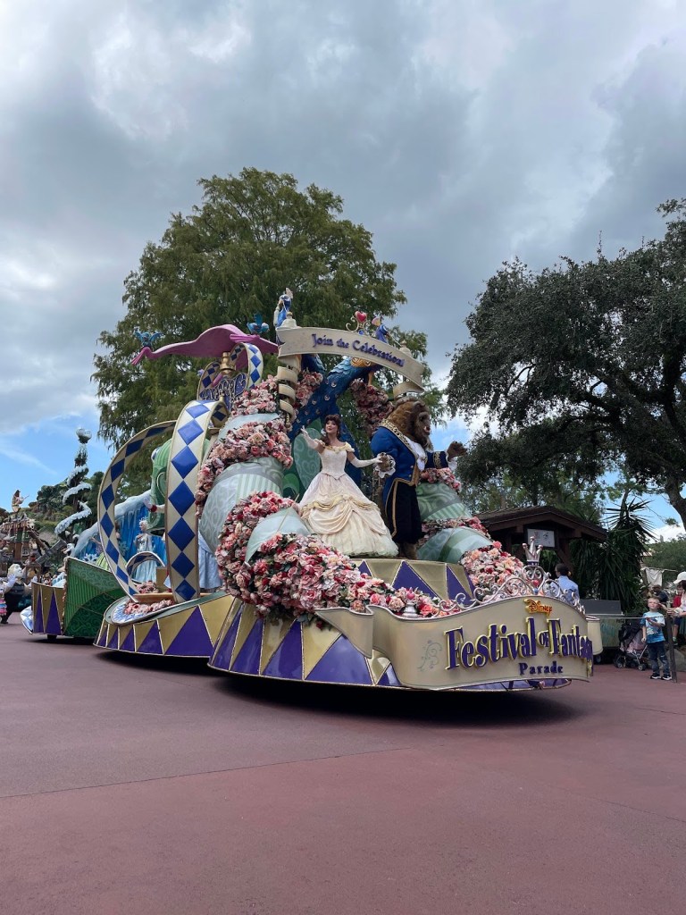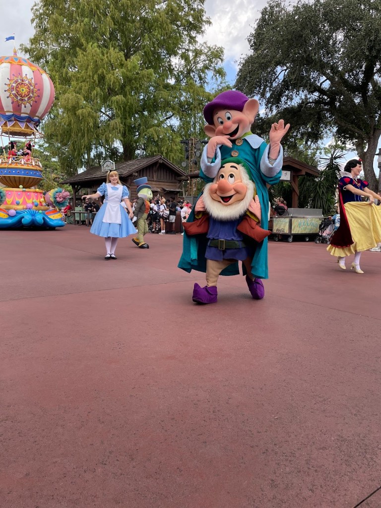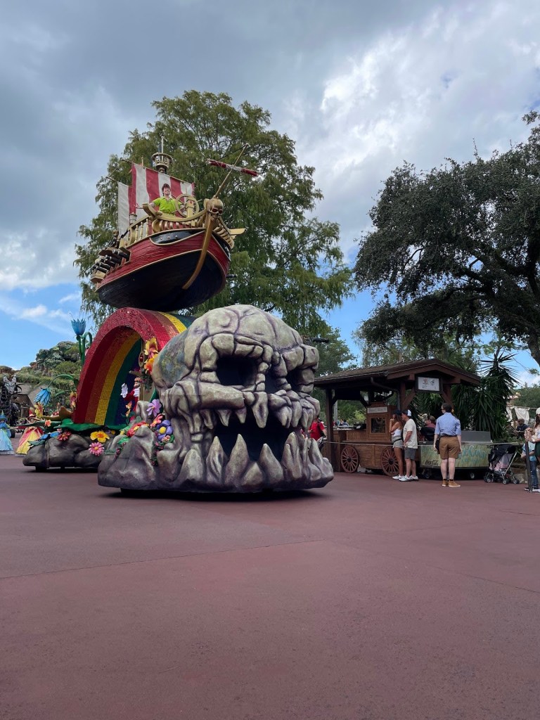 Después nos subimos al Space Mountain haciendo uso del “Rider Switch” ya que Guillem no se podía subir. Y luego Guillem y yo nos subimos a The Magic Carpets of Aladdin. Después fuimos a buscar sitio para ver el desfile que hacían a las 14:00h. Comimos allí de tupper ya que al quedarnos en casa el día anterior habíamos podido prepararnos algo de comer para así no perder tiempo en Magic Kingdom.