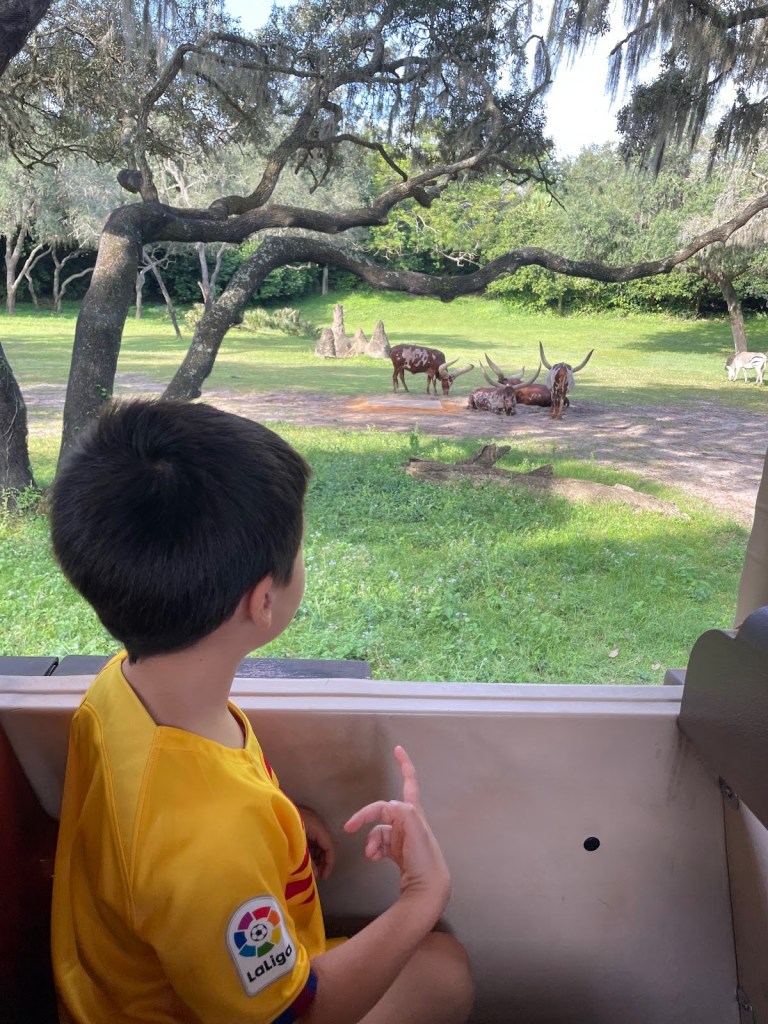 Una vez los dos nos habíamos subido a la atracción de Avatar, la cuál os confirmamos que es espectacular, nos fuimos a la parte de África donde hicimos el Kilimanjaro Safaris. Te subes en un vehículo al aire libre y realizamos una visita guiada por la sabana africana viendo animales reales deambulando libremente. Guillem alucinaba viendo a los animales.