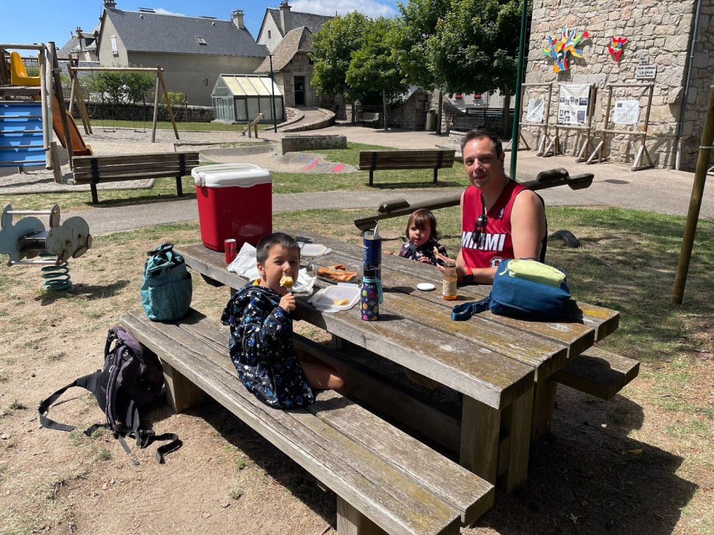 Una vez ya de vuelta al coche hicimos otra tirada y paramos a comer en el Aire de pique-nique en Peyre en Aubrac, a 439 km. de Canet de Mar, unas 4 horas de coche. Es un lugar que encontró Diana buscando por internet saliendo de la autopista. Así nos alejamos de las áreas de servicio de las autopistas que en verano están abarrotadas. De hecho, comimos completamente solos y Guillem y Laia pudieron correr por el parque después de comer.